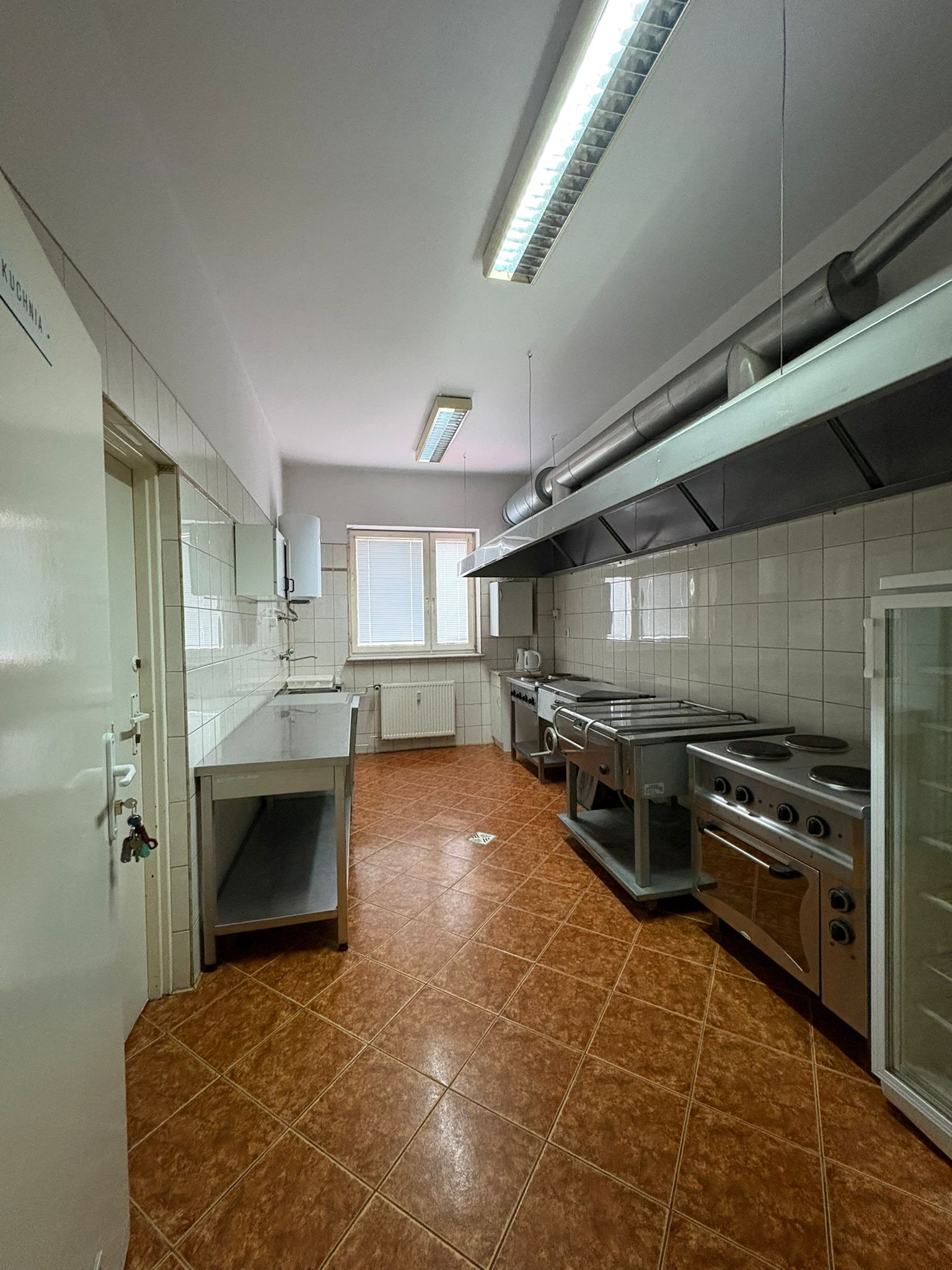 Przestronna sala na parterze biurowca Szczecineckiej Spółdzielni Mieszkaniowej. Zaplecze kuchenne z pełnym wyposażeniem.